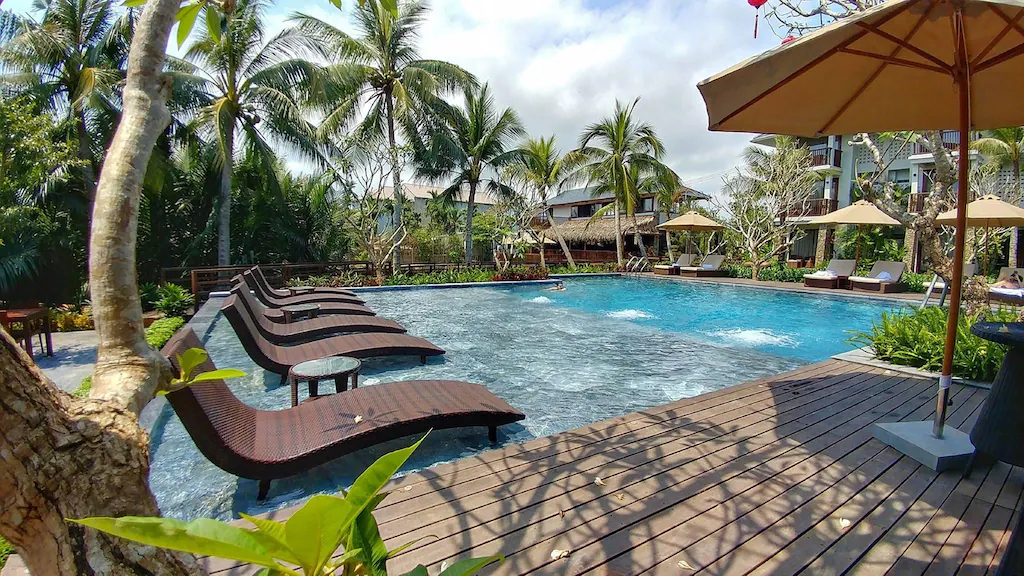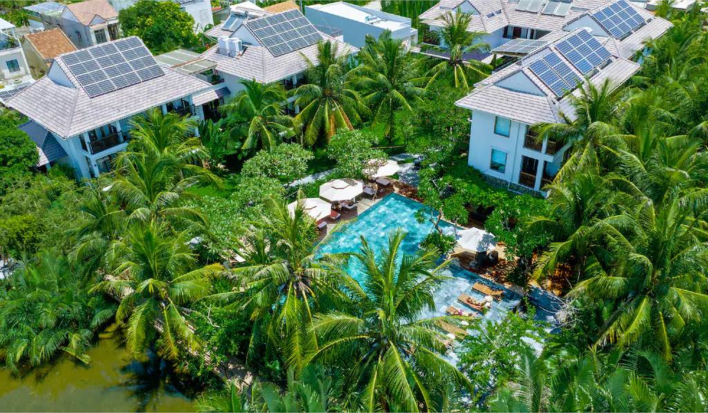 - 🏨 Khách sạn Hội An Eco Lodge & Spa là khu nghỉ mát tọa lạc giữa khung cảnh xanh tươi và thanh bình của 🌴 Rừng Dừa Cẩm Thanh, Hội An, nơi quý khách có thể dễ dàng khám phá không gian phố cổ bằng 🚲 xe đạp hoặc 🚌 shuttle bus băng qua những 🌾 cánh đồng lúa, rặng dừa nước đậm chất sinh thái, đồng quê.